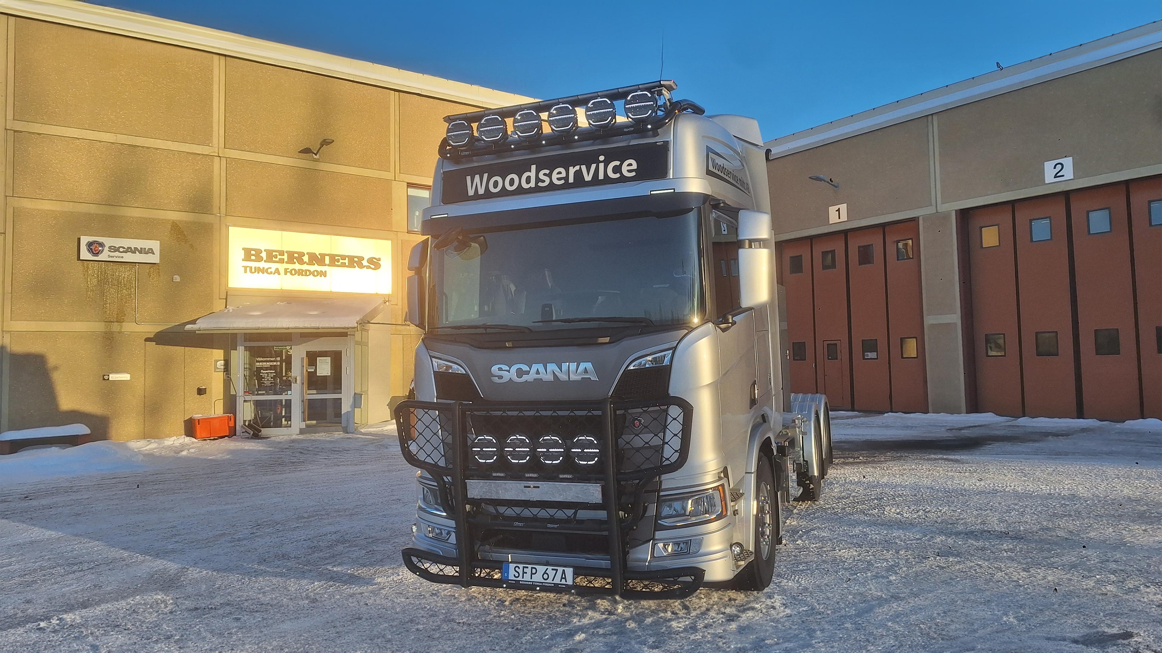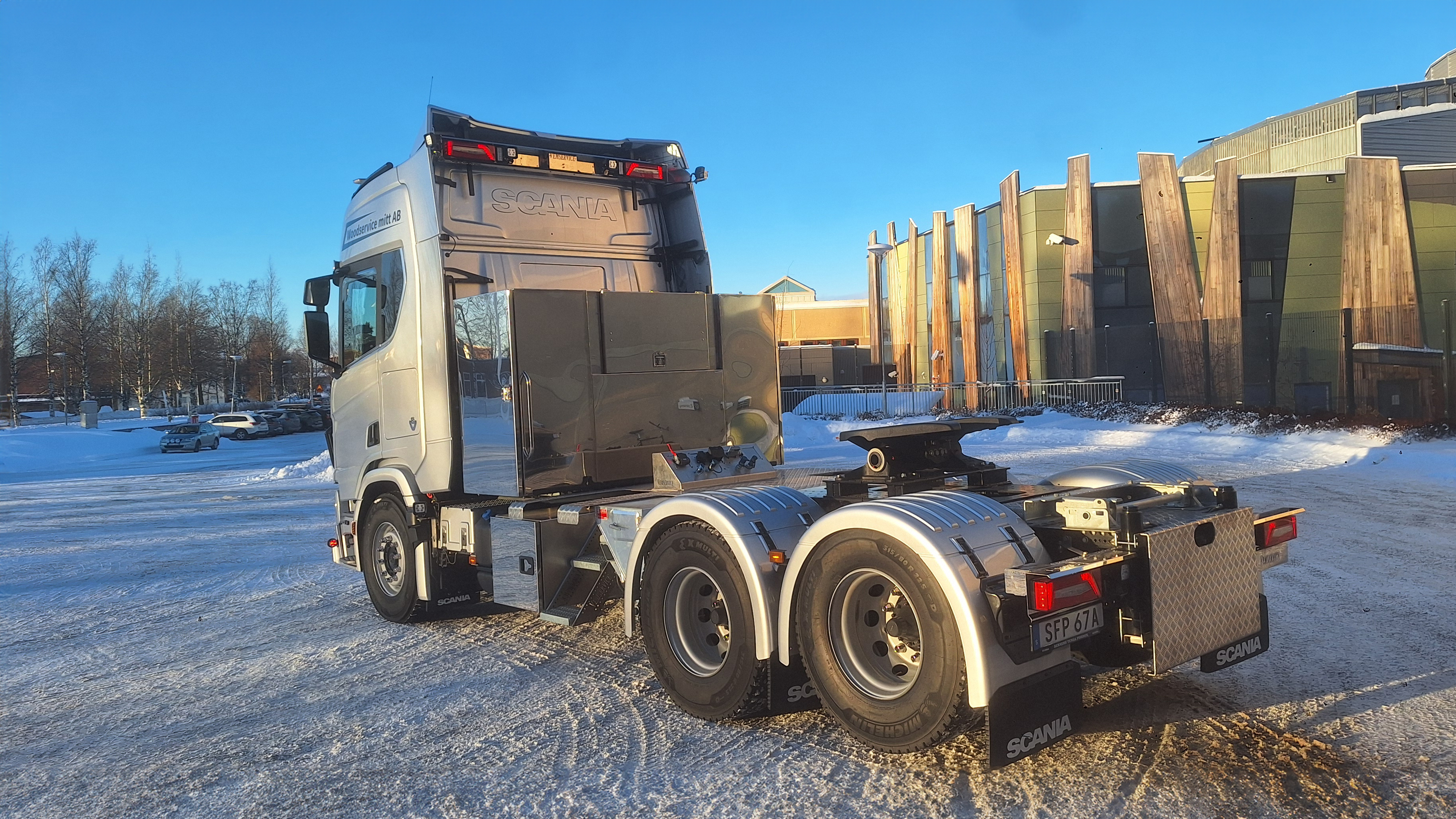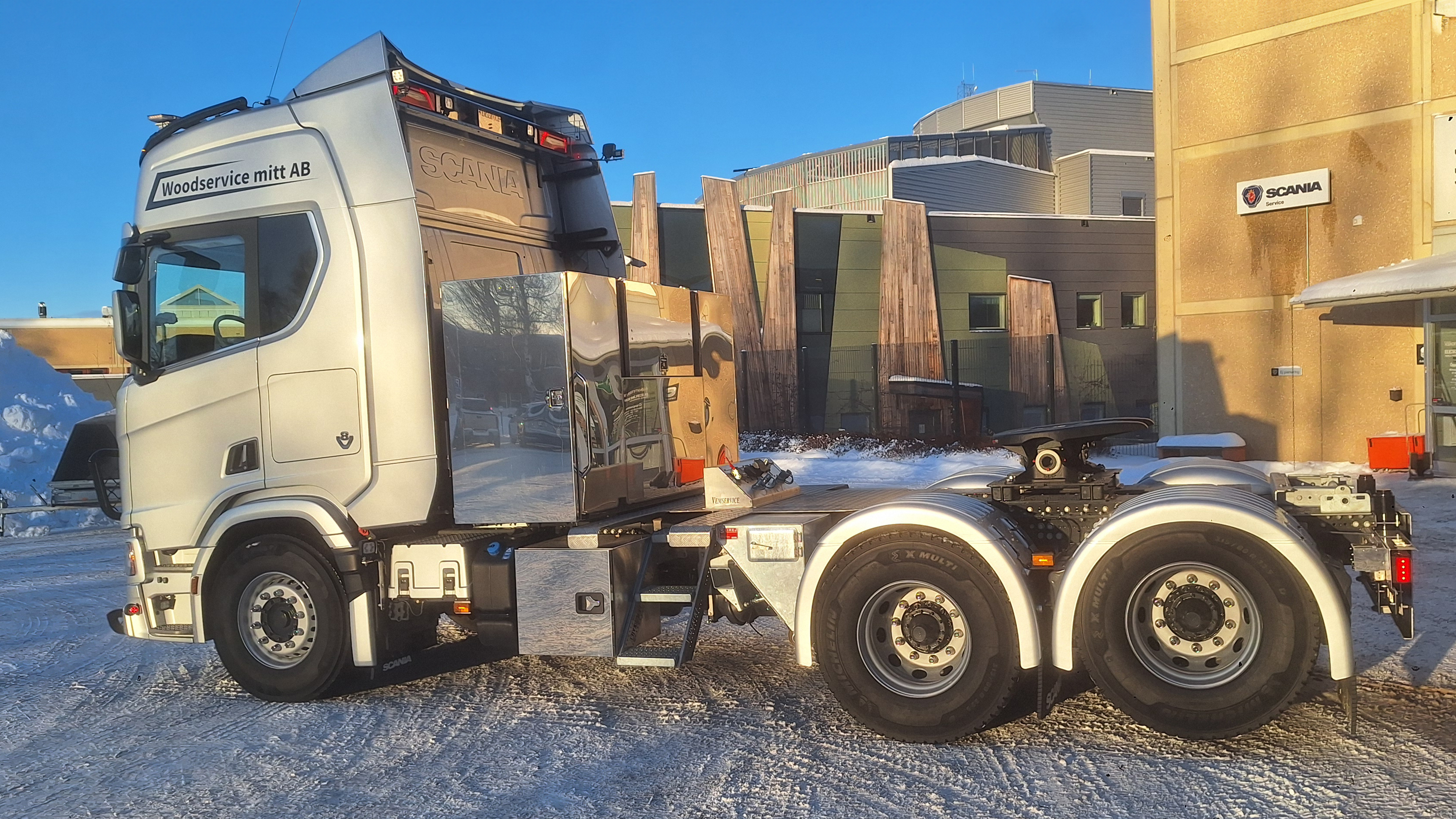 Woodservice Mitt AB investerar i en ny Tungdragare. Denna gång valde dem en Scania R660 6X4 med Tandemlyft. Påbyggnationen gjordes hos Vemservice AB. Alfa Reklam AB fixade dekoren. Belysning och övriga önskemål gjordes hos oss på Berners Tunga Fordon i Östersund. Vi tackar Mattias och Daniel för förtroendet att få leverera denna fina bil, kör försiktigt.